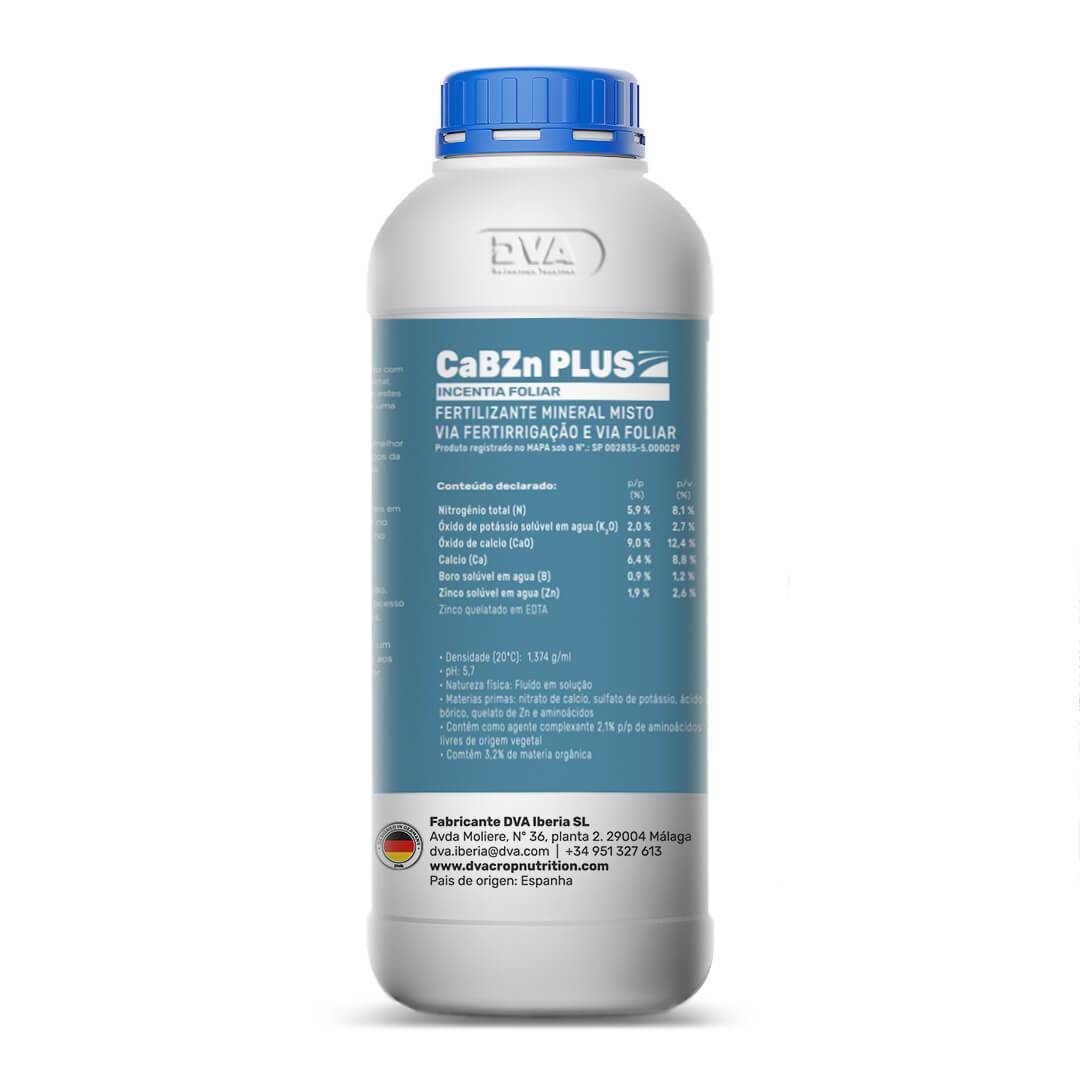Incentia CaBZn Plus, é um fertilizante líquido enriquecido com cálcio complexado por aminoácidos livres de origem vegetal, contém boro e zinco na forma de quelato, todos estes nutrientes na forma em que são apresentados, possuem uma fácil assimilação pelas plantas. Incentia CaBZn plus é um produto desenhado para ser melhor absorvido pela planta, melhorando os processos fisiológicos da mesma, conseguindo um uso eficiente dos nutrientes nos diferentes processos. O Cálcio metabolizado dá origem a fortes paredes celulares em flores e frutos; o Boro desempenha um papel importante no transporte de açúcares e amidos das folhas aos frutos e no processo de reprodução floral; o Zinco é um ativador do crescimento das plantas. Estes elementos são indispensáveis nas etapas de floração, crecimento de frutos e bulbos, pois assegura um bom processo de polinização, fecundação de flores e frutos. A incorporação de aminoácidos livres e naturais, fornece um fator que proporciona a planta uma resposta mais rápida aos possíveis causados no momento da floração ou por fatores abióticos.