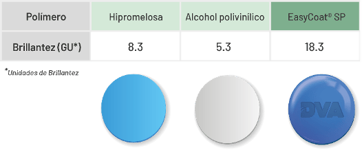 El componente filmógeno clave de Easycoat SP aumenta la brillantez de la película formada. Éste sistema de recubrimiento tiene un impacto mínimo sobre la liberación , un brillo superior a los sistemas de recubrimiento convencionales (HPMC o PVA) con el beneficio de no tener que implementar las condiciones de aplicación de un grageado.